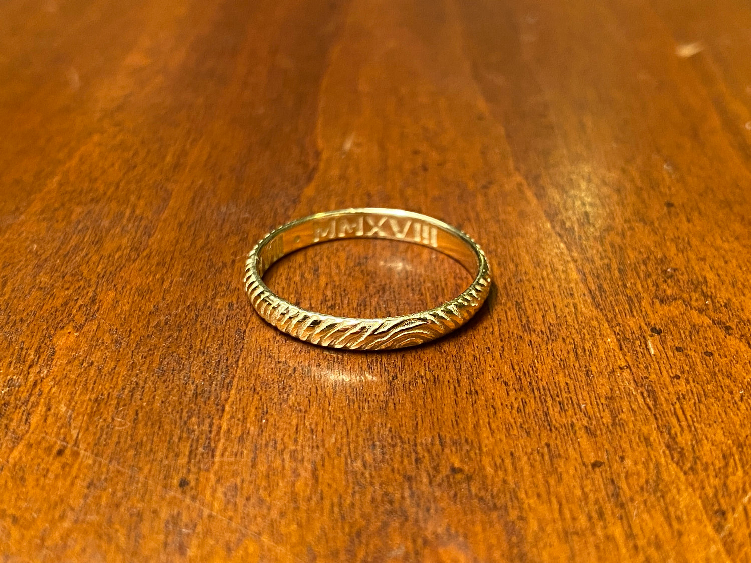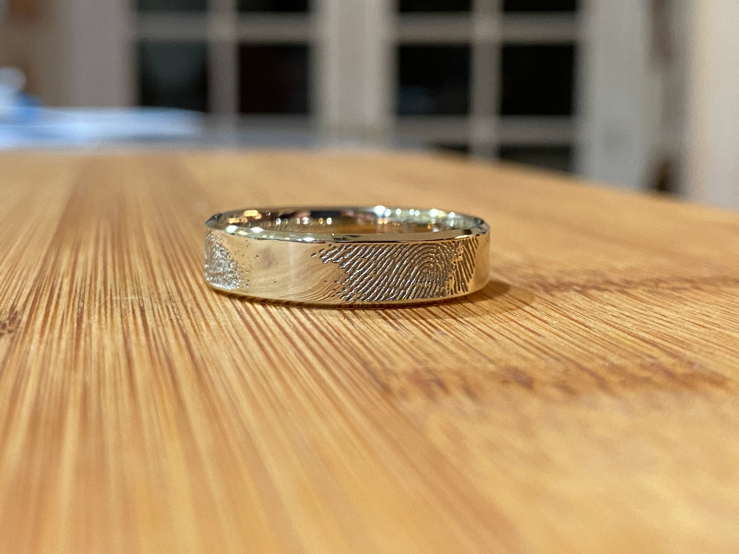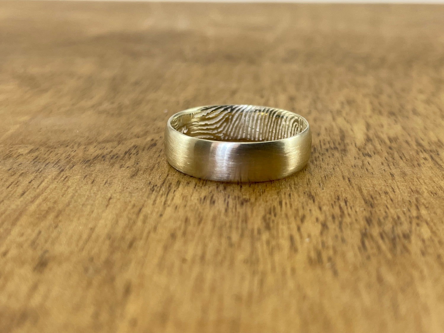 3mm yellow gold ring with a fignerprint on the outside and roman numerals on the inside.