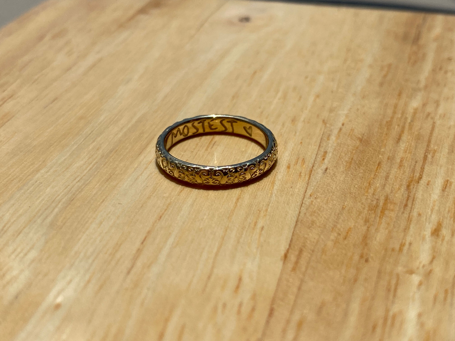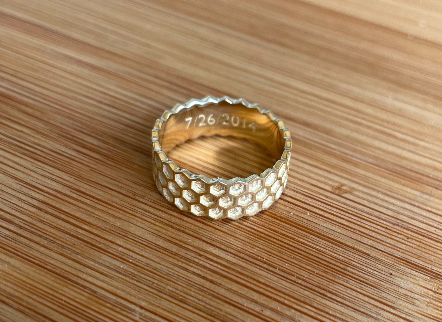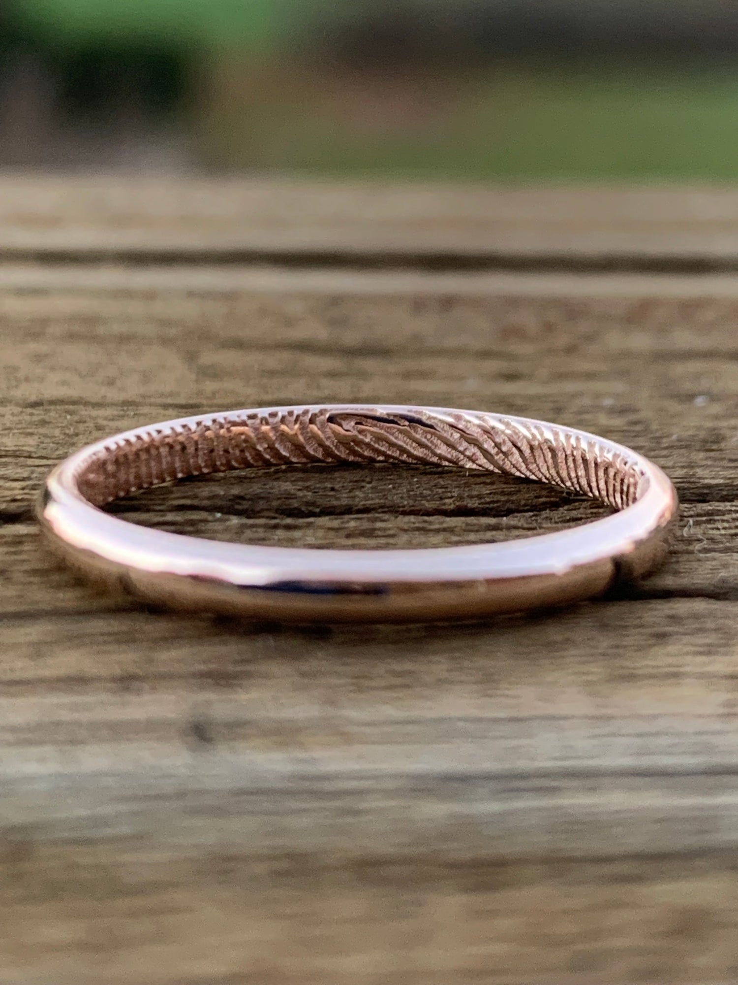 3mm yellow gold ring with a fignerprint on the outside and roman numerals on the inside.