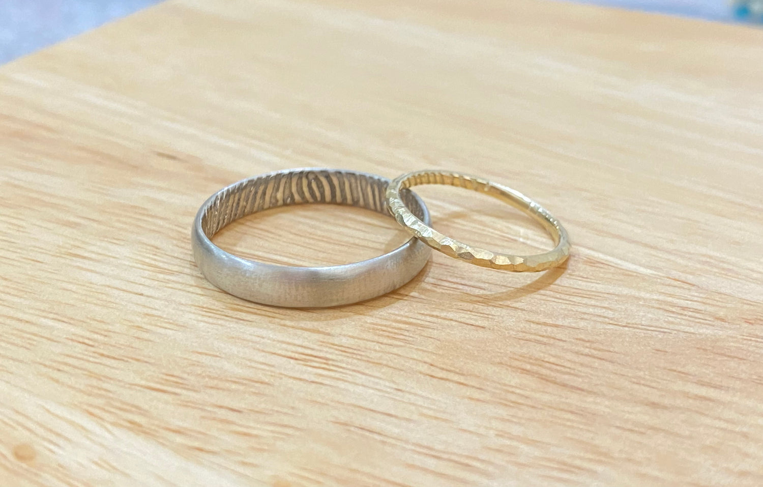 This wedding ring set is a 4mm white gold ring with a brushed finish paired with a 1.5mm yellow gold ring with a hammered finish.