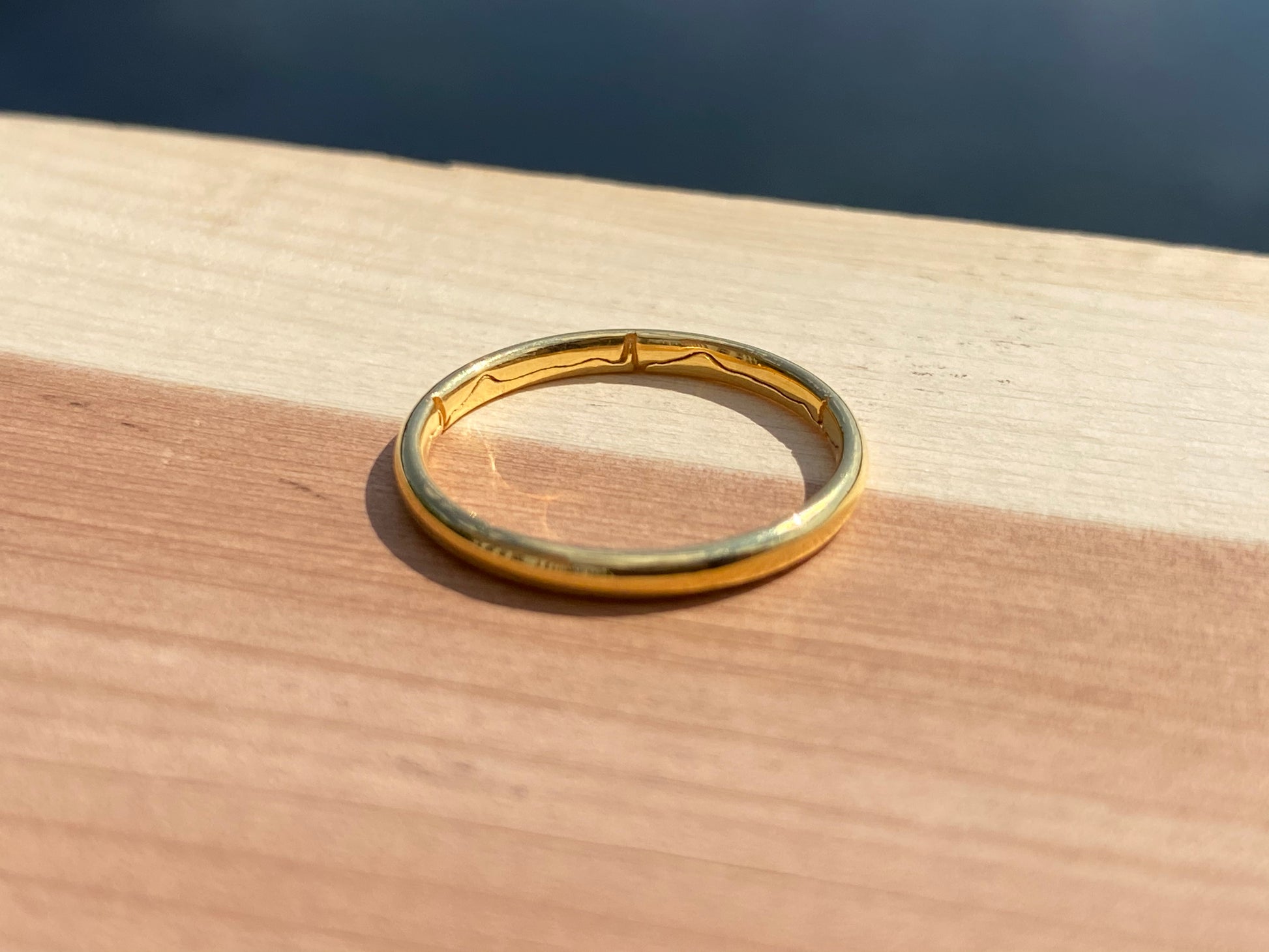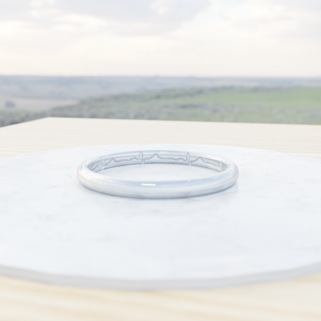 This narrow half round, comfort fit style is great for simpler patterns like an EKG. While possible to fit on 2mm, more complex engravings like handwriting and text will be hard to discern in the final design. 3mm minimum recommended for fingerprint and handwriting images.