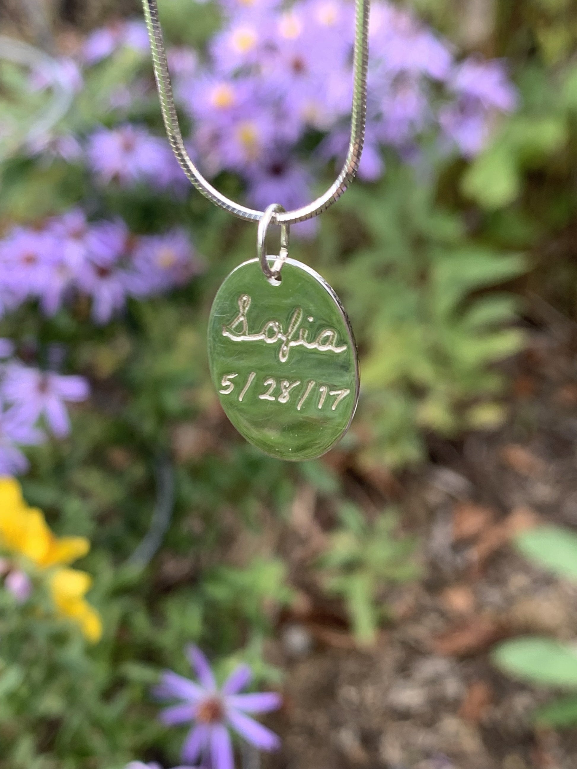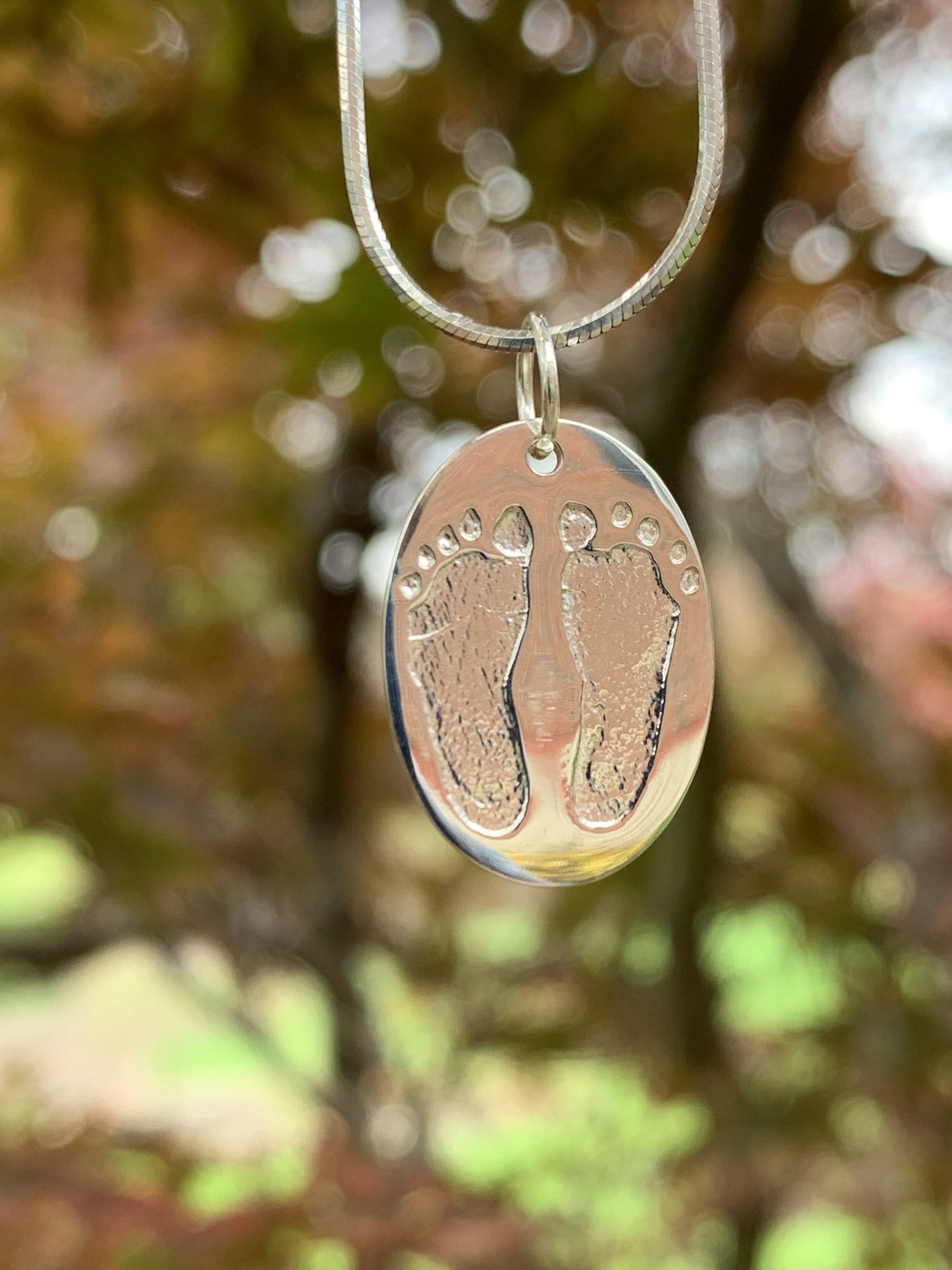 Our classic pendant, available in oval or heart shape, with newborn footprints engraved. You may choose to have a name or birthday below the footprint, or on the reverse side. Consider making it extra special by uploading your own handwriting of the name!